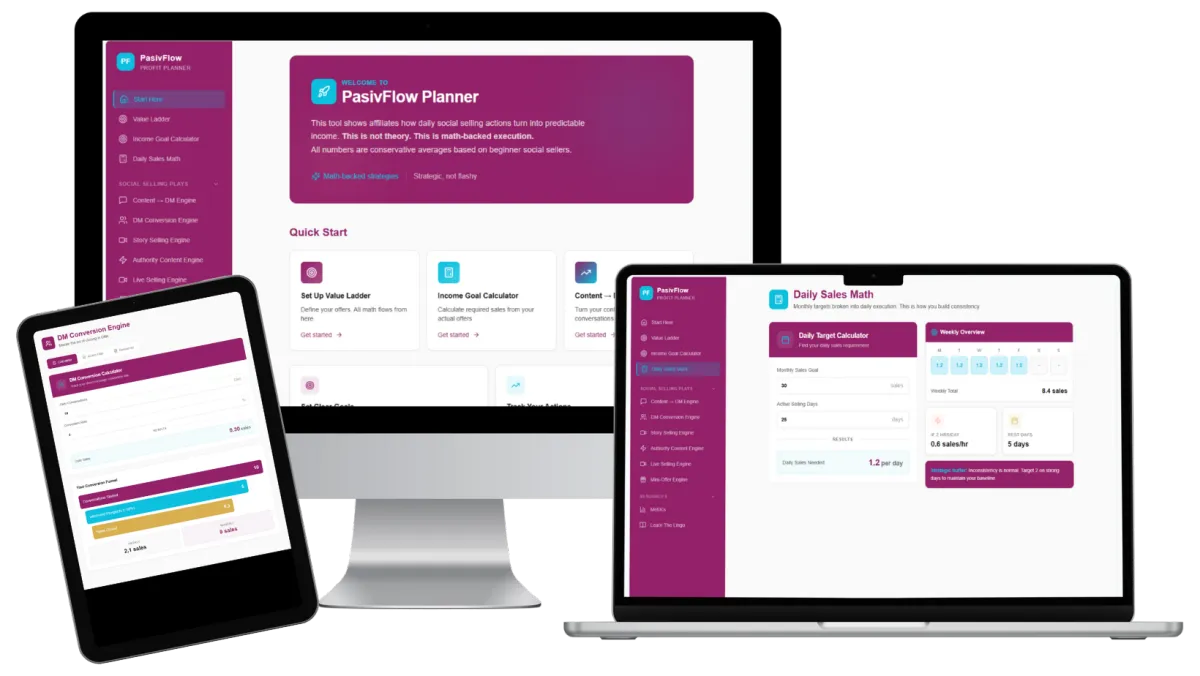 Know exactly how to turn daily content and conversations into sales. Set your income goal, choose your offers, and see how many sales you need — daily, weekly, and monthly. No guessing. No overwhelm. Just clear actions that lead to real income.